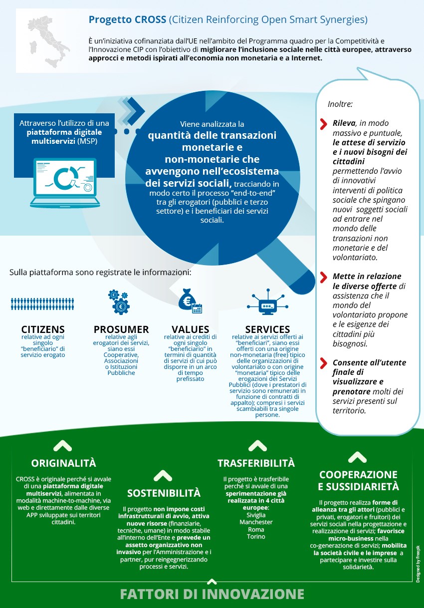 Il Progetto CROSS (Citizen Reinforcing Open Smart Synergies), cofinanziato dall’UE nell’ambito del Programma quadro per la Competitività e l’Innovazione CIP coinvolge quattro differenti città europee, “nodi” (Roma, Torino, Manchester e Siviglia) ed è attuato da differenti partner del settore pubblico e del volontariato, con l’obiettivo generale di far emergere e rilevare la quantità delle transazioni monetarie e non monetarie che avvengono nell’ecosistema dei servizi sociali e contribuire a colmare la distanza tra la quantità delle risorse pubbliche stanziate per i servizi sociali e l’aumento dei fabbisogni che la crisi economica e sociale continua ad accrescere.