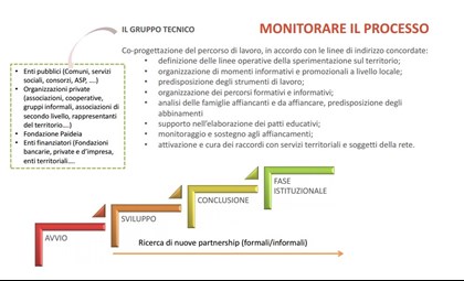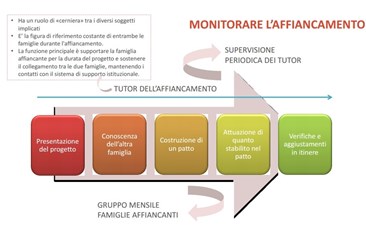 R.Esiste un gruppo tecnico di coordinamento che si riunisce con cadenza periodica (circa una volta al mese) e si occupa di definire le linee operative della sperimentazione, organizzare i momenti informativi e promozionali a livello locale, predisporre gli strumenti di lavoro, realizzare i percorsi formativi per operatori, tutor e famiglie affiancanti, predisporre gli abbinamenti per l’affiancamento, monitorare le azioni e definire l’assetto organizzativo della fase a regime del progetto. L’affiancamento viene costruito attraverso una progettazione condivisa, in cui ciascun soggetto può portare il proprio contributo, a partire dalle proprie capacità e dal proprio ruolo. Anche le famiglie vengono coinvolte in un’ottica di co-progettazione: i contenuti del patto educativo vengono infatti concordati e scritti dalle due famiglie, con il supporto del tutor e dell’assistente sociale di riferimento.