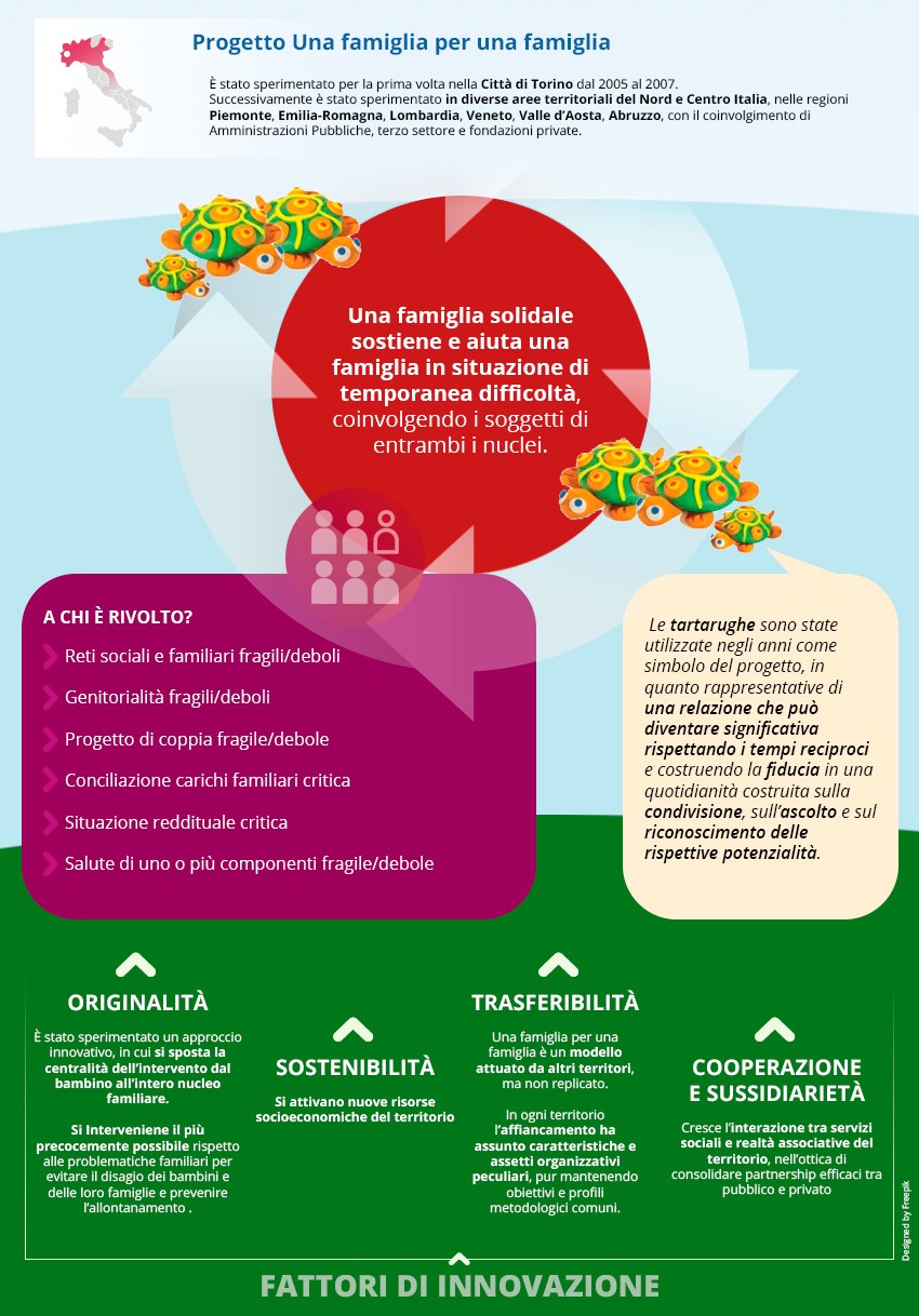 Il progetto “Una Famiglia per una famiglia”, ideato nel 2003 dal Comune di Torino e dalla Fondazione Paideia nell’ambito del bando di idee “La fatica di crescere”, è stato sperimentato per la prima volta nella Città di Torino dal 2005 al 2007. Successivamente, è stato inserito nelle politiche sociali del Comune ed è stato sperimentato in diverse aree te